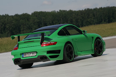 First presented at the 2007 Geneva Show back in March, TechArt’s Porsche 997 Turbo based GTstreet is now available for sale with prices starting off at €245,000 MSRP -about $331,000. If any of you find the will power to separate yourselves from that sort of cash you’ll get a modified 2008 Porsche 911 Turbo equipped with a 3.6-liter, 6cylinder turbocharged boxer engine that develops 630 hp at 6,800 rpm, up from standard 480 hp while peak torque increases from 620 Nm to 820 Nm at 4,500 rpm.Power is transferred to all four wheels through a modified transmission with TechArt gear-throw shortening. According to the German tuner, the GTstreet accelerates from standstill to 100 km/h (62mph) in just 3.2 sec, 200 km/h (124mph) after just 10.9 sec while its speedometer stops at exactly 345 km/h (215mph). -Full press release and more images after the jump